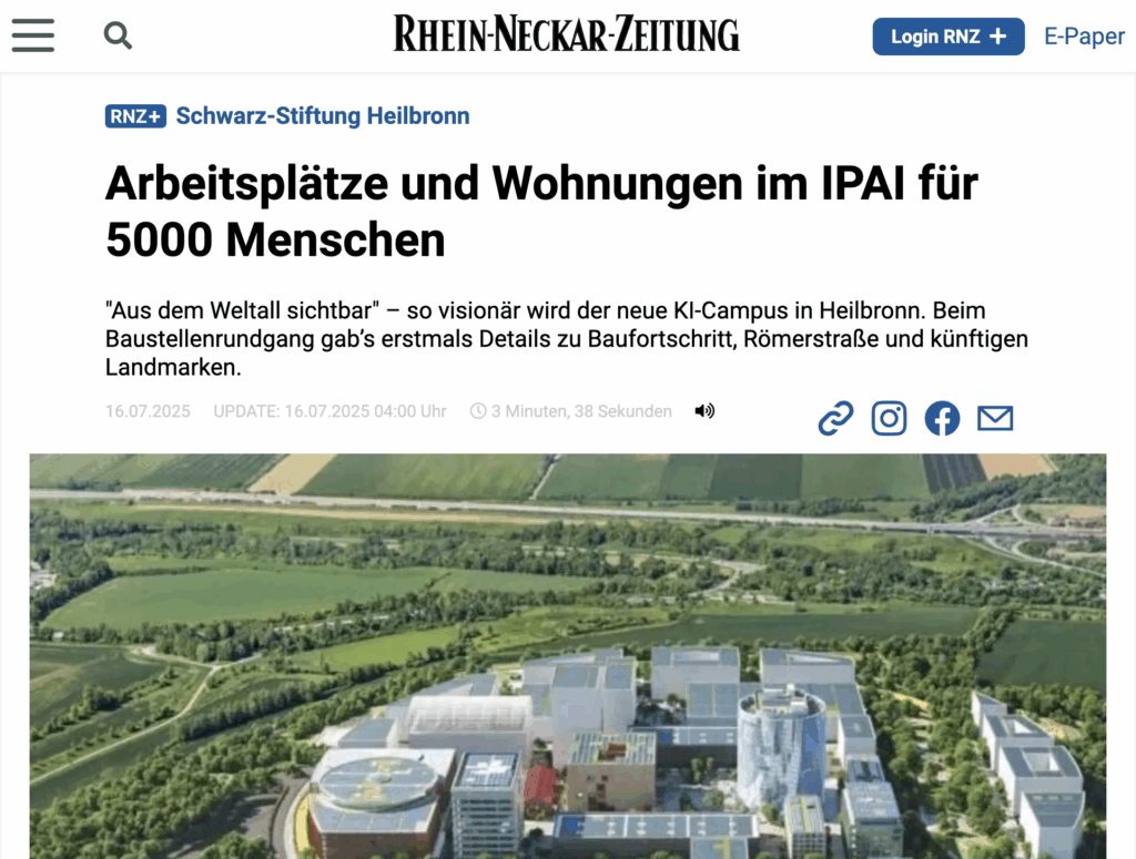 Mit dem IPAI entsteht in Heilbronn ein hochmoderner KI-Campus, der langfristig rund 5.000 Arbeitsplätze schaffen wird. Die Kombination aus Forschung, Unternehmensansiedlungen und moderner Infrastruktur macht die Region für Fachkräfte und Familien noch attraktiver.